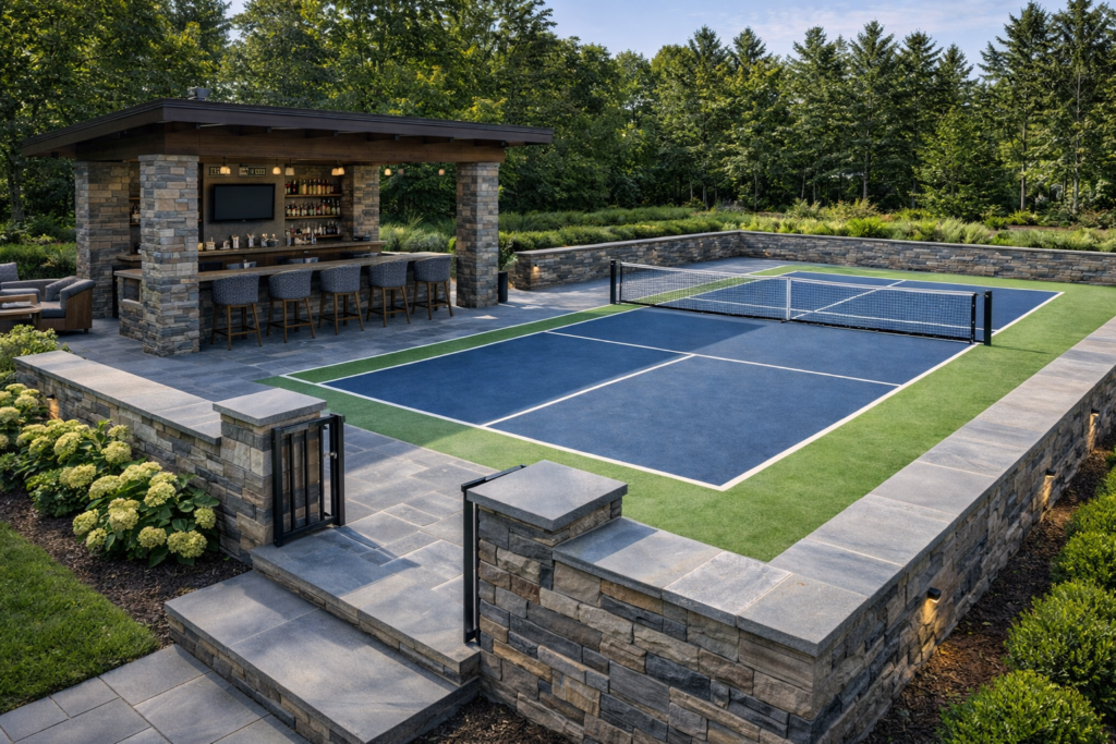 From a full patio transformation to a custom pickleball court, heckler’s patio, and stone wall, this project created the ultimate outdoor entertainment space.