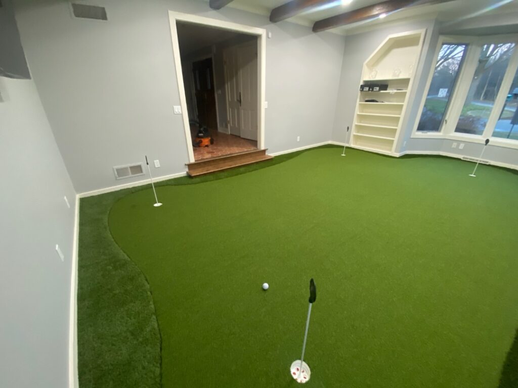 An indoor putting green is a custom artificial turf system installed inside your home to replicate the look and feel of a real golf green.